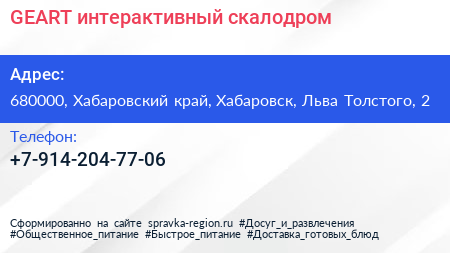 GEART, интерактивный скалодром по адресу 680000, Хабаровский край, Хабаровск, Льва Толстого, 2 в дальнейшем Организация, размещена в следующих категориях: