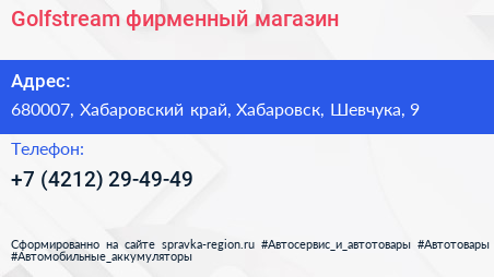 Golfstream, фирменный магазин по адресу 680007, Хабаровский край, Хабаровск, Шевчука, 9 в дальнейшем Организация, размещена в следующих категориях:
