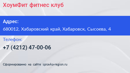 ХоумФит, фитнес-клуб по адресу 680012, Хабаровский край, Хабаровск, Сысоева, 4 в дальнейшем Организация, размещена в следующих категориях: