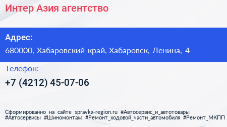 Интер Азия, агентство по адресу 680000, Хабаровский край, Хабаровск, Ленина, 4 в дальнейшем Организация, размещена в следующих категориях: