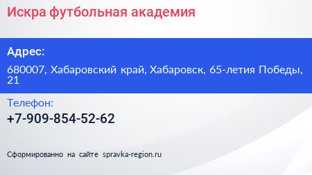 Искра, футбольная академия по адресу 680007, Хабаровский край, Хабаровск, 65-летия Победы, 21 в дальнейшем Организация, размещена в следующих категориях: