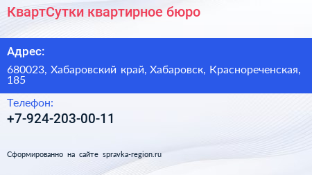КвартСутки, квартирное бюро по адресу 680023, Хабаровский край, Хабаровск, Краснореченская, 185 в дальнейшем Организация, размещена в следующих категориях: