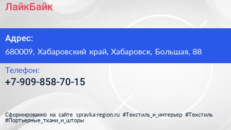 ЛайкБайк по адресу 680009, Хабаровский край, Хабаровск, Большая, 88 в дальнейшем Организация, размещена в следующих категориях: