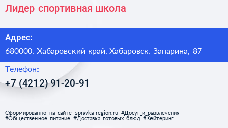 Лидер, спортивная школа по адресу 680000, Хабаровский край, Хабаровск, Запарина, 87 в дальнейшем Организация, размещена в следующих категориях: