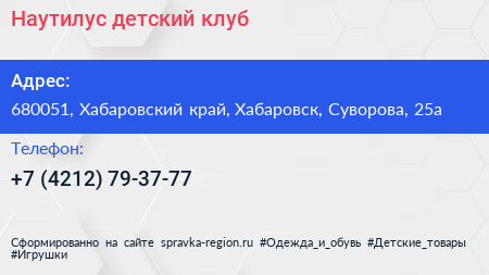 Наутилус, детский клуб по адресу 680051, Хабаровский край, Хабаровск, Суворова, 25а в дальнейшем Организация, размещена в следующих категориях: