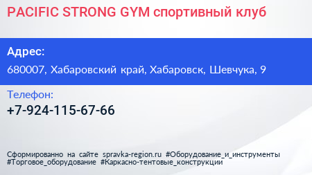 PACIFIC STRONG GYM, спортивный клуб по адресу 680007, Хабаровский край, Хабаровск, Шевчука, 9 в дальнейшем Организация, размещена в следующих категориях:
