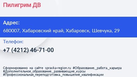 Пилигрим-ДВ по адресу 680007, Хабаровский край, Хабаровск, Шевчука, 29 в дальнейшем Организация, размещена в следующих категориях: