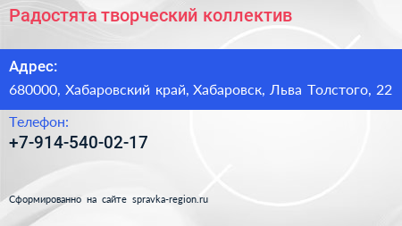 Радостята, творческий коллектив по адресу 680000, Хабаровский край, Хабаровск, Льва Толстого, 22 в дальнейшем Организация, размещена в следующих категориях:
