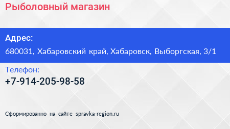 Рыболовный магазин по адресу 680031, Хабаровский край, Хабаровск, Выборгская, 3/1 в дальнейшем Организация, размещена в следующих категориях: