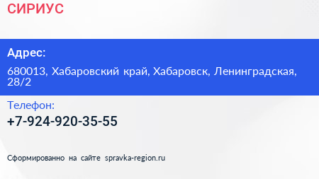 СИРИУС по адресу 680013, Хабаровский край, Хабаровск, Ленинградская, 28/2 в дальнейшем Организация, размещена в следующих категориях: