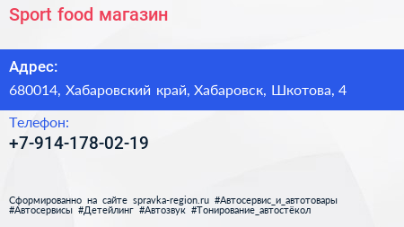 Sport food, магазин по адресу 680014, Хабаровский край, Хабаровск, Шкотова, 4 в дальнейшем Организация, размещена в следующих категориях: