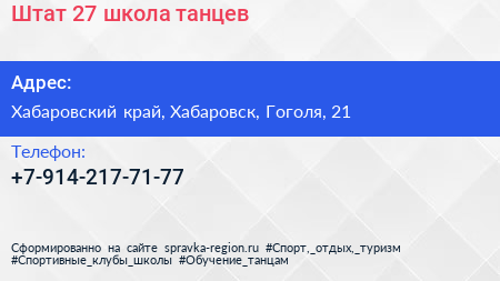 Штат 27, школа танцев по адресу Хабаровский край, Хабаровск, Гоголя, 21 в дальнейшем Организация, размещена в следующих категориях: