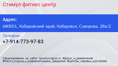 Стимул, фитнес-центр по адресу 680051, Хабаровский край, Хабаровск, Суворова, 28а/2 в дальнейшем Организация, размещена в следующих категориях: