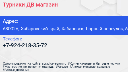 Турники-ДВ, магазин по адресу 680026, Хабаровский край, Хабаровск, Горный переулок, 6 в дальнейшем Организация, размещена в следующих категориях: