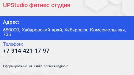 UPStudio, фитнес-студия по адресу 680000, Хабаровский край, Хабаровск, Комсомольская, 73Б в дальнейшем Организация, размещена в следующих категориях: