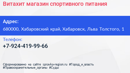 Витахит, магазин спортивного питания по адресу 680000, Хабаровский край, Хабаровск, Льва Толстого, 1 в дальнейшем Организация, размещена в следующих категориях: