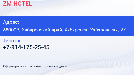 ZM-HOTEL по адресу 680009, Хабаровский край, Хабаровск, Хабаровская, 27 в дальнейшем Организация, размещена в следующих категориях: