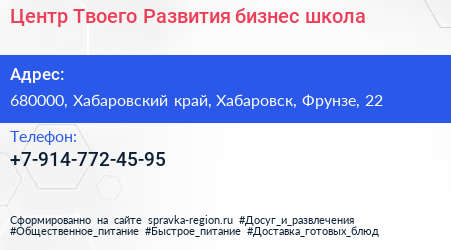 Центр Твоего Развития, бизнес-школа по адресу 680000, Хабаровский край, Хабаровск, Фрунзе, 22 в дальнейшем Организация, размещена в следующих категориях: