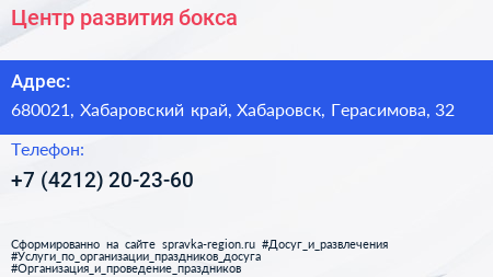 Центр развития бокса по адресу 680021, Хабаровский край, Хабаровск, Герасимова, 32 в дальнейшем Организация, размещена в следующих категориях: