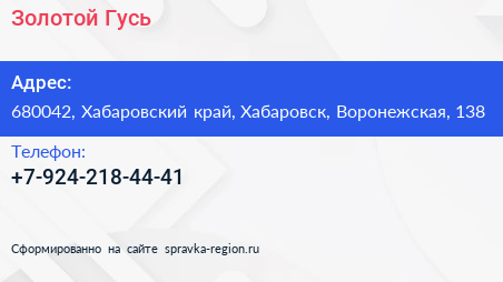 Золотой Гусь по адресу 680042, Хабаровский край, Хабаровск, Воронежская, 138 в дальнейшем Организация, размещена в следующих категориях: