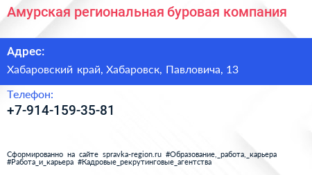 Амурская региональная буровая компания по адресу Хабаровский край, Хабаровск, Павловича, 13 в дальнейшем Организация, размещена в следующих категориях: