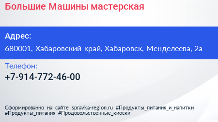 Большие Машины, мастерская по адресу 680001, Хабаровский край, Хабаровск, Менделеева, 2а в дальнейшем Организация, размещена в следующих категориях: