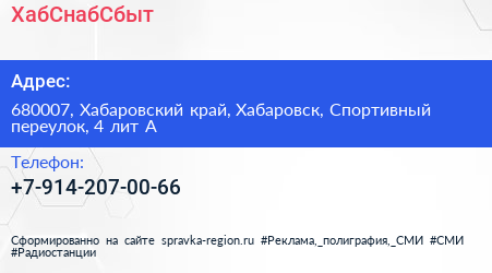 ХабСнабСбыт по адресу 680007, Хабаровский край, Хабаровск, Спортивный переулок, 4 лит А в дальнейшем Организация, размещена в следующих категориях: