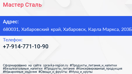 Мастер Сталь по адресу 680031, Хабаровский край, Хабаровск, Карла Маркса, 203Б в дальнейшем Организация, размещена в следующих категориях: