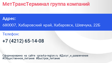 МетТрансТерминал, группа компаний по адресу 680007, Хабаровский край, Хабаровск, Шевчука, 22Б в дальнейшем Организация, размещена в следующих категориях: