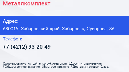 Металлкомплект по адресу 680015, Хабаровский край, Хабаровск, Суворова, 86 в дальнейшем Организация, размещена в следующих категориях: