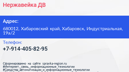 Нержавейка ДВ по адресу 680012, Хабаровский край, Хабаровск, Индустриальная, 19а/2 в дальнейшем Организация, размещена в следующих категориях: