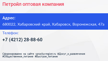 Петройл, оптовая компания по адресу 680022, Хабаровский край, Хабаровск, Воронежская, 47а в дальнейшем Организация, размещена в следующих категориях: