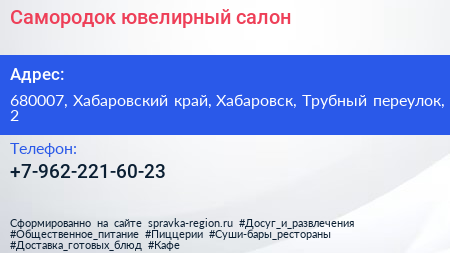 Самородок, ювелирный салон по адресу 680007, Хабаровский край, Хабаровск, Трубный переулок, 2 в дальнейшем Организация, размещена в следующих категориях: