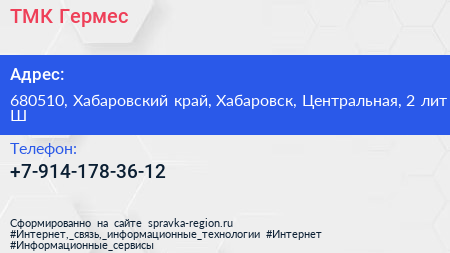 ТМК Гермес по адресу 680510, Хабаровский край, Хабаровск, Центральная, 2 лит Ш в дальнейшем Организация, размещена в следующих категориях: