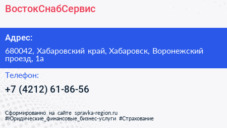 ВостокСнабСервис по адресу 680042, Хабаровский край, Хабаровск, Воронежский проезд, 1а в дальнейшем Организация, размещена в следующих категориях: