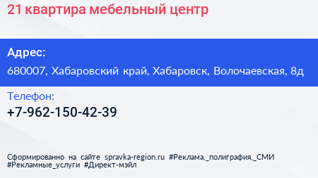 21 квартира, мебельный центр по адресу 680007, Хабаровский край, Хабаровск, Волочаевская, 8д в дальнейшем Организация, размещена в следующих категориях: