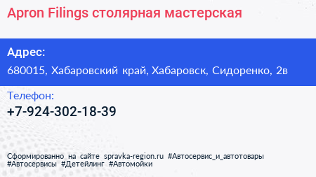 Apron & Filings, столярная мастерская по адресу 680015, Хабаровский край, Хабаровск, Сидоренко, 2в в дальнейшем Организация, размещена в следующих категориях: