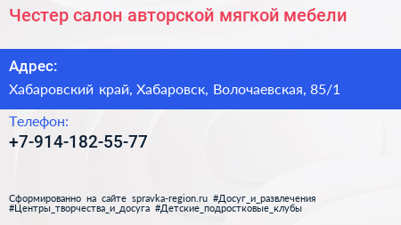 Честер, салон авторской мягкой мебели по адресу Хабаровский край, Хабаровск, Волочаевская, 85/1 в дальнейшем Организация, размещена в следующих категориях: