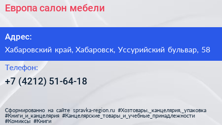 Европа, салон мебели по адресу Хабаровский край, Хабаровск, Уссурийский бульвар, 58 в дальнейшем Организация, размещена в следующих категориях: