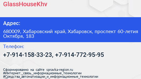 GlassHouseKhv по адресу 680009, Хабаровский край, Хабаровск, проспект 60-летия Октября, 183 в дальнейшем Организация, размещена в следующих категориях: