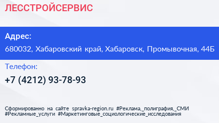 ЛЕССТРОЙСЕРВИС по адресу 680032, Хабаровский край, Хабаровск, Промывочная, 44Б в дальнейшем Организация, размещена в следующих категориях:
