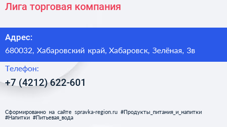 Лига, торговая компания по адресу 680032, Хабаровский край, Хабаровск, Зелёная, 3в в дальнейшем Организация, размещена в следующих категориях: