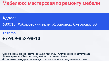 Мебелюкс, мастерская по ремонту мебели по адресу 680015, Хабаровский край, Хабаровск, Суворова, 80 в дальнейшем Организация, размещена в следующих категориях: