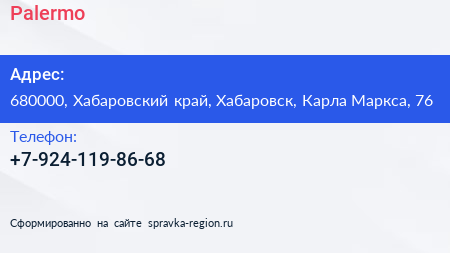 Palermo по адресу 680000, Хабаровский край, Хабаровск, Карла Маркса, 76 в дальнейшем Организация, размещена в следующих категориях: