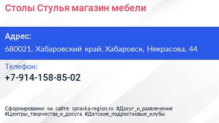 Столы & Стулья, магазин мебели по адресу 680021, Хабаровский край, Хабаровск, Некрасова, 44 в дальнейшем Организация, размещена в следующих категориях: