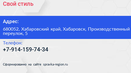 Свой стиль по адресу 680052, Хабаровский край, Хабаровск, Производственный переулок, 5 в дальнейшем Организация, размещена в следующих категориях: