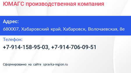 ЮМАГС, производственная компания по адресу 680007, Хабаровский край, Хабаровск, Волочаевская, 8е в дальнейшем Организация, размещена в следующих категориях: