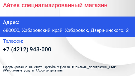 Айтек, специализированный магазин по адресу 680000, Хабаровский край, Хабаровск, Дзержинского, 2 в дальнейшем Организация, размещена в следующих категориях: