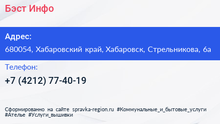 Бэст-Инфо по адресу 680054, Хабаровский край, Хабаровск, Стрельникова, 6а в дальнейшем Организация, размещена в следующих категориях: