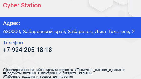 Cyber Station по адресу 680000, Хабаровский край, Хабаровск, Льва Толстого, 2 в дальнейшем Организация, размещена в следующих категориях: